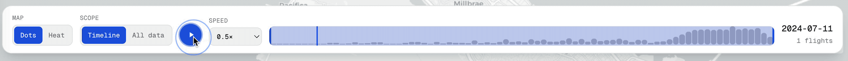I built a logger to maintain a rolling collection of the last two years of flight data. The data is sparse, but the main filtering is based on location and reason. The timeline shows the density of flights and lets you toggle between a standard dot view and a heat map variation.